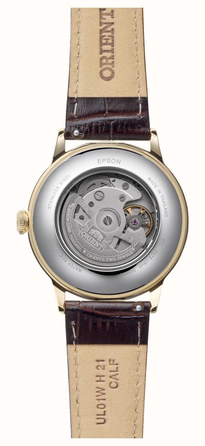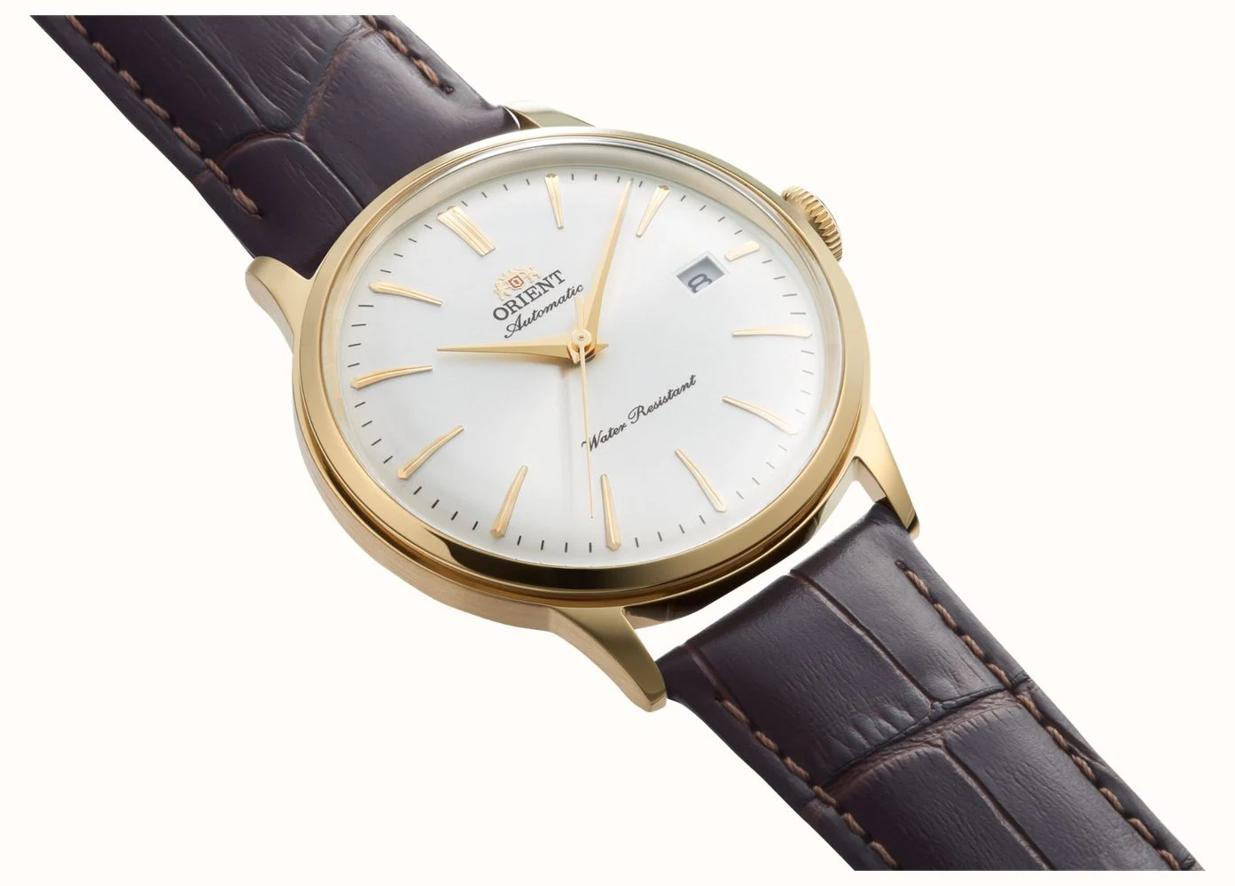 The Orient Bambino Classic RA-AC0028S30Bis a vintage-inspired automatic dress watch from the “Classic & Simple Style” collection. It is characterized by its elegant gold-tone finish, domed crystal, and minimalist white dial, making it a popular entry-level mechanical timepiece.
